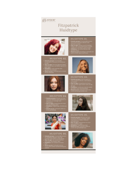 - Type 6 (Zeer donkere of zwarte huid, verbrandt nooit, wordt zeer gemakkelijk diep bruin): Dit type wordt meestal gezien bij personen van sub-Saharaans Afrikaanse afkomst. Deze huid veel melanine, wat bijdraagt aan een natuurlijke bescherming tegen de effecten van UV-straling. Personen met dit huidtype krijgen zelden zonnebrand.