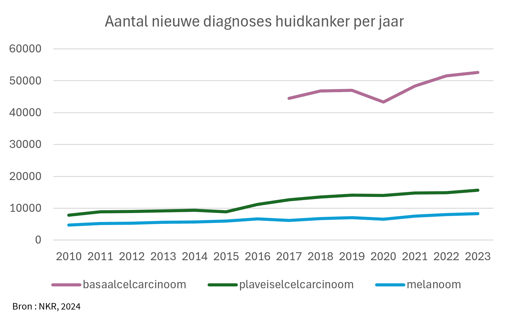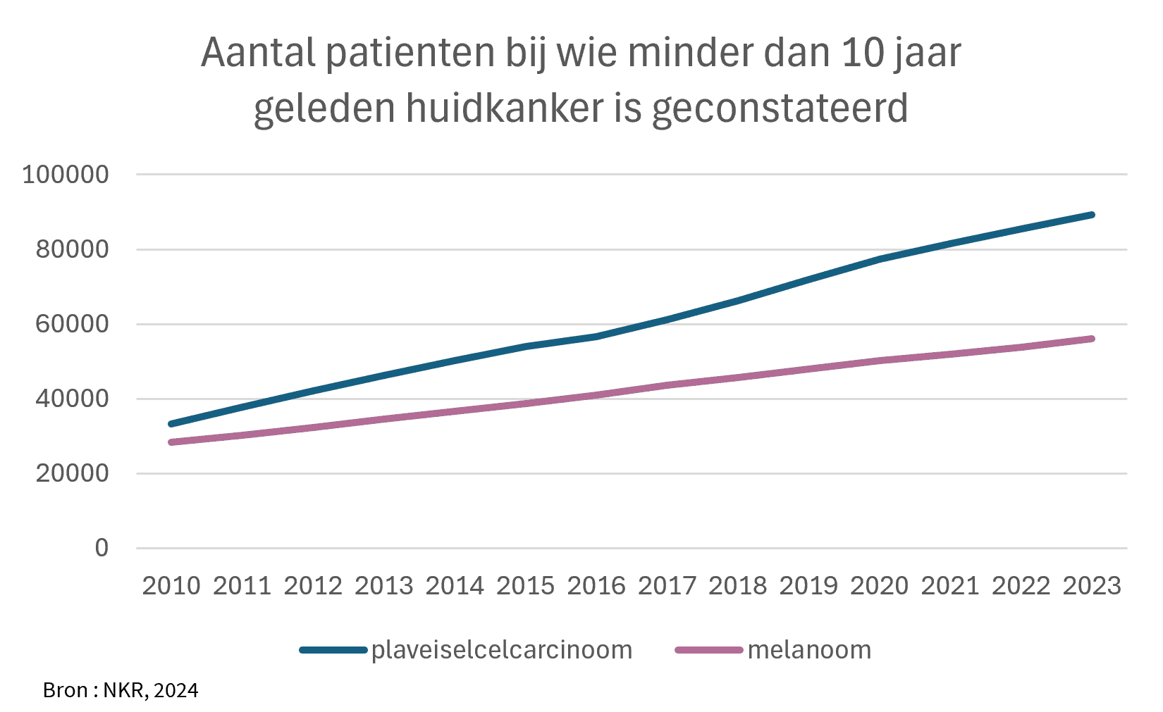 In totaal gaat het dus inmiddels om 80000 nieuwe diagnoses per jaar. Dit komt overeen met een heel voetbalelftal bijna elk uur. Daarnaast nemen de aantallen ook nog het snelste toe van alle kankersoorten. Deze stijging is veel groter dan verwacht mag worden op basis van de vergrijzing van de Nederlandse bevolking. Dit geeft een grote druk in de Nederlandse ziekenhuizen en zelfstandige behandelcentra. Niet alleen door de nieuwe diagnoses en behandeling daarvan, maar ook voor periodieke controle van patiënten na diagnose en behandeling.